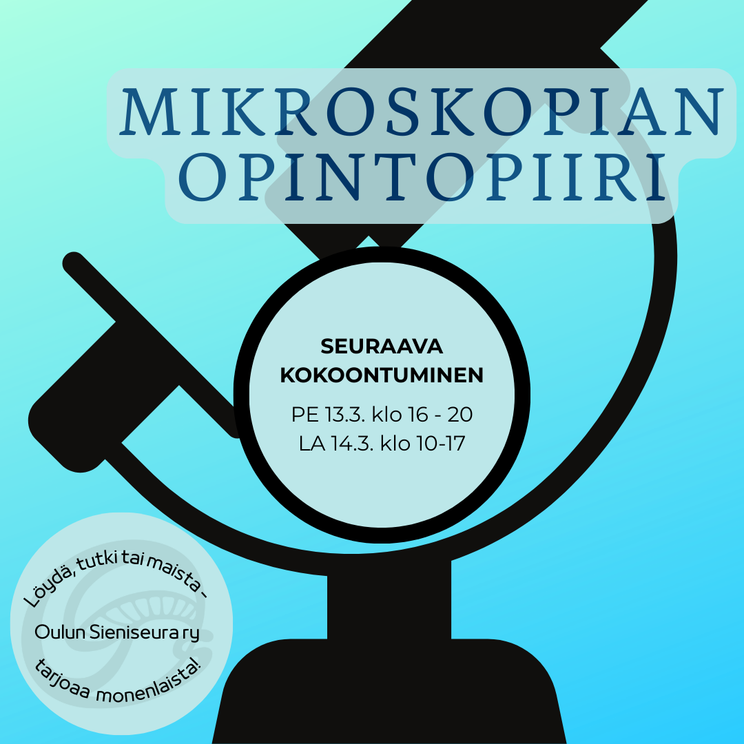 Mikroskopian opintopiiri Oulu Pe 10. 4. klo 16 - 20 La 11.4. klo 10 – 17 Vielä kerran ennen maastotaukoa! Oletko vielä tutkinut sieniä mikroskoopilla? Tällä välineellä tuttuun aiheeseen saa aivan…