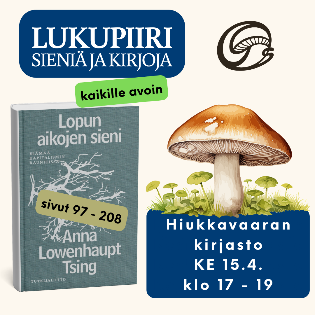 Tämä on kaikille avointa toimintaamme! Keskiviikko 15.4. klo 17 - 19 Hiukkavaaran kirjasto Lukupiiri kokoontuu käsittelemään nyt toisen kerran Anna Lowenhaupt Tsingin kirjaa Lopun aikojen sieni -…