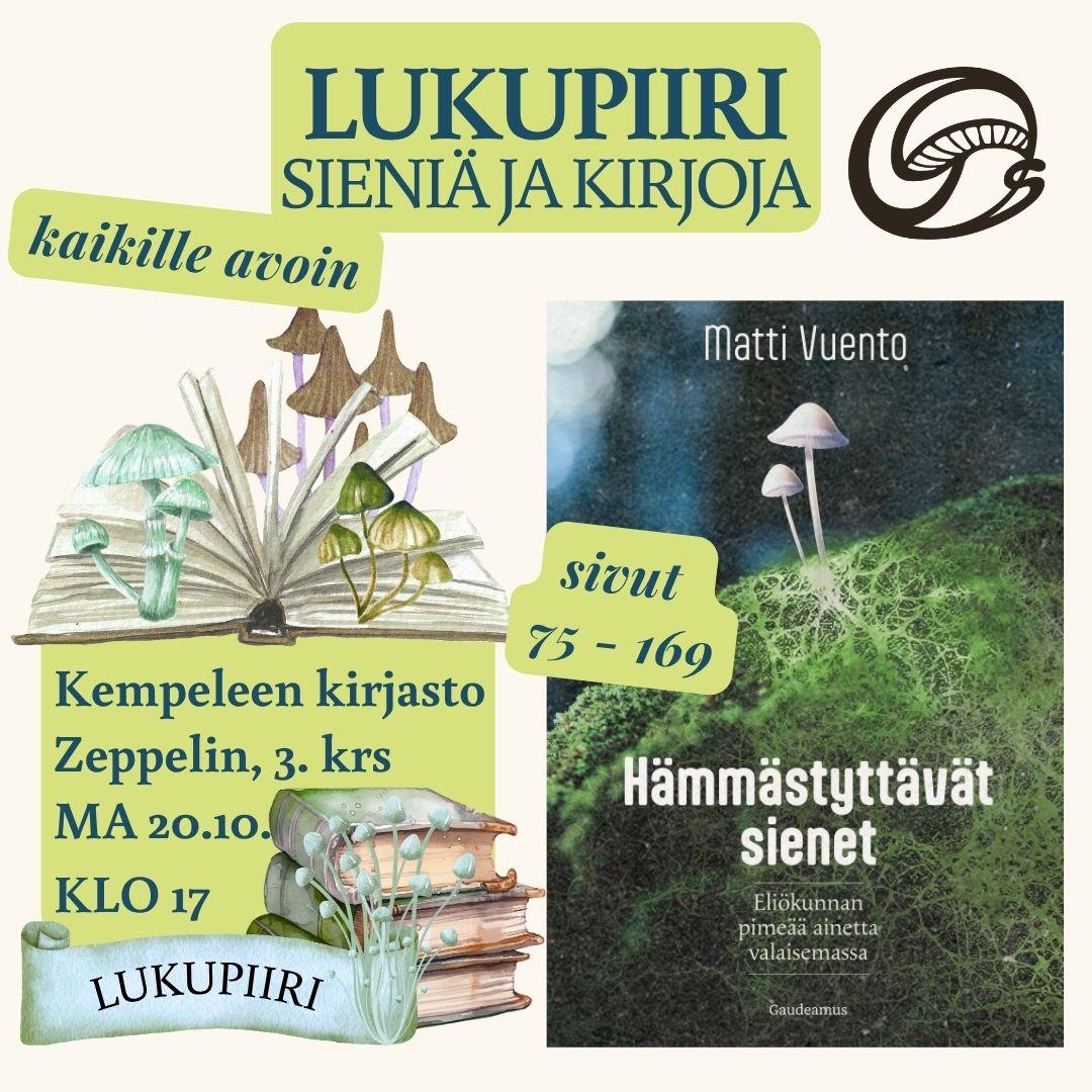 Tämä on kaikille avoin tapahtuma! Maanantaina 29.9. Kempeleen Zeppelinissä klo 17 - 19. Lukupiiri aloittaa syyskautensa Matti Vuenton teoksella ”Hämmästyttävät sienet – eliökunnan pimeää ainetta…