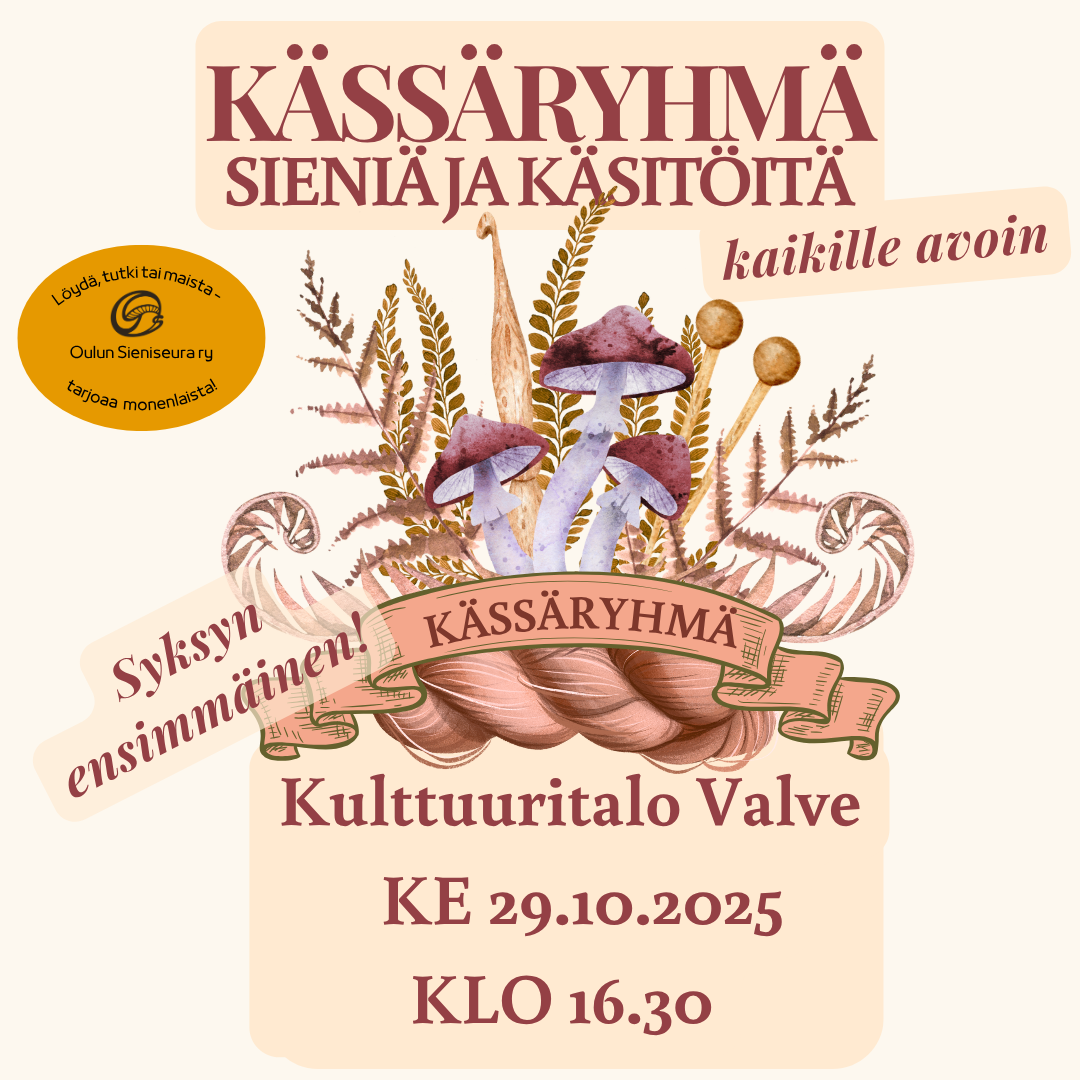 Oulun Sieniseura ry on kaikkien sienistä kiinnostuneiden seura. Sienet yhdistävät niin tutkijoita, ruokasienestäjiä, käsityöharrastajia kuin lukijoitakin! Toimimme jäsentemme voimin, ja tuotamme toimintaa pääasiassa jäsenillemme. LIITY JÄSENEKSI